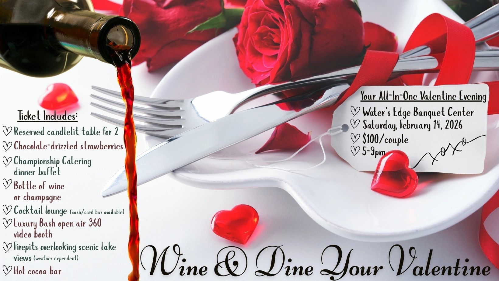 Celebrate Valentine’s Day at the Water’s Edge Banquet Center on Saturday, February 14, 2026, from 5–9 PM. Escape the rush of crowded restaurants and indulge in a relaxed, all-in-one romantic evening with your special someone.